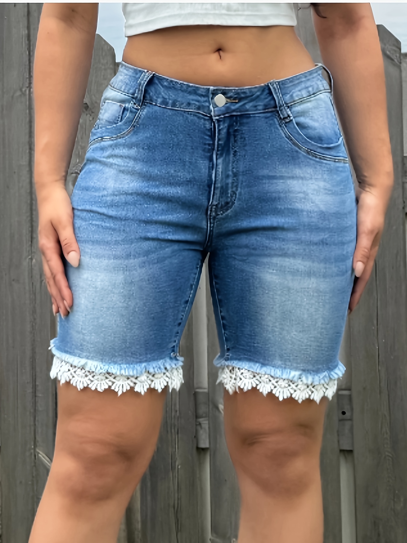2025 New Women's Stretch Slim Fit Denim Shorts with Lace Trim, High-Waisted Skinny Jeans for a Look, Stylish and Versatile Casual Wear