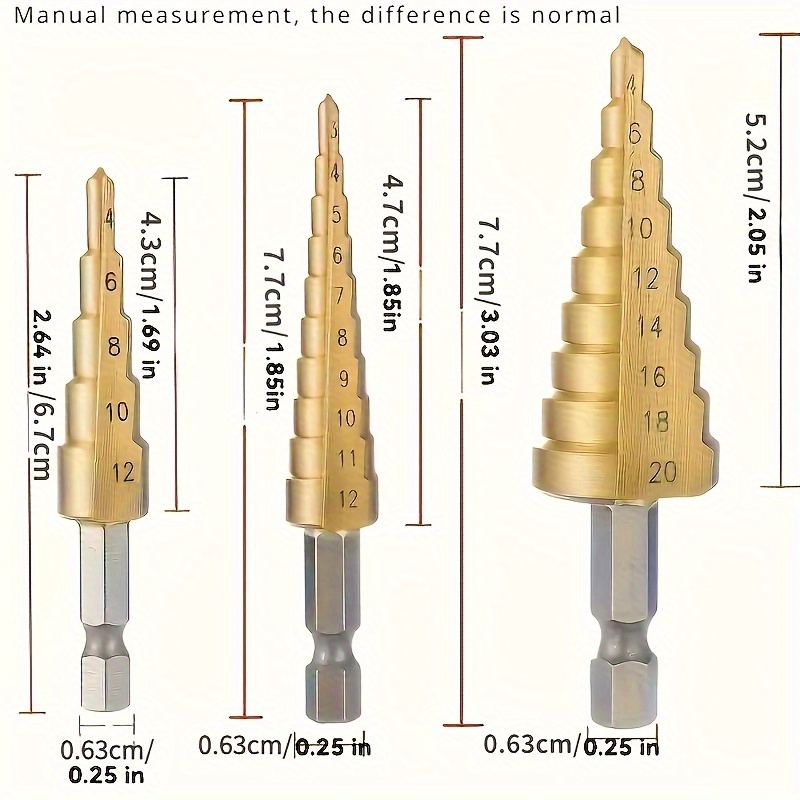 3pcs Titanium-Coated High-Speed Steel Step Drill Bit Set for Wood & Metal - Durable, Multi-Functional & Efficient