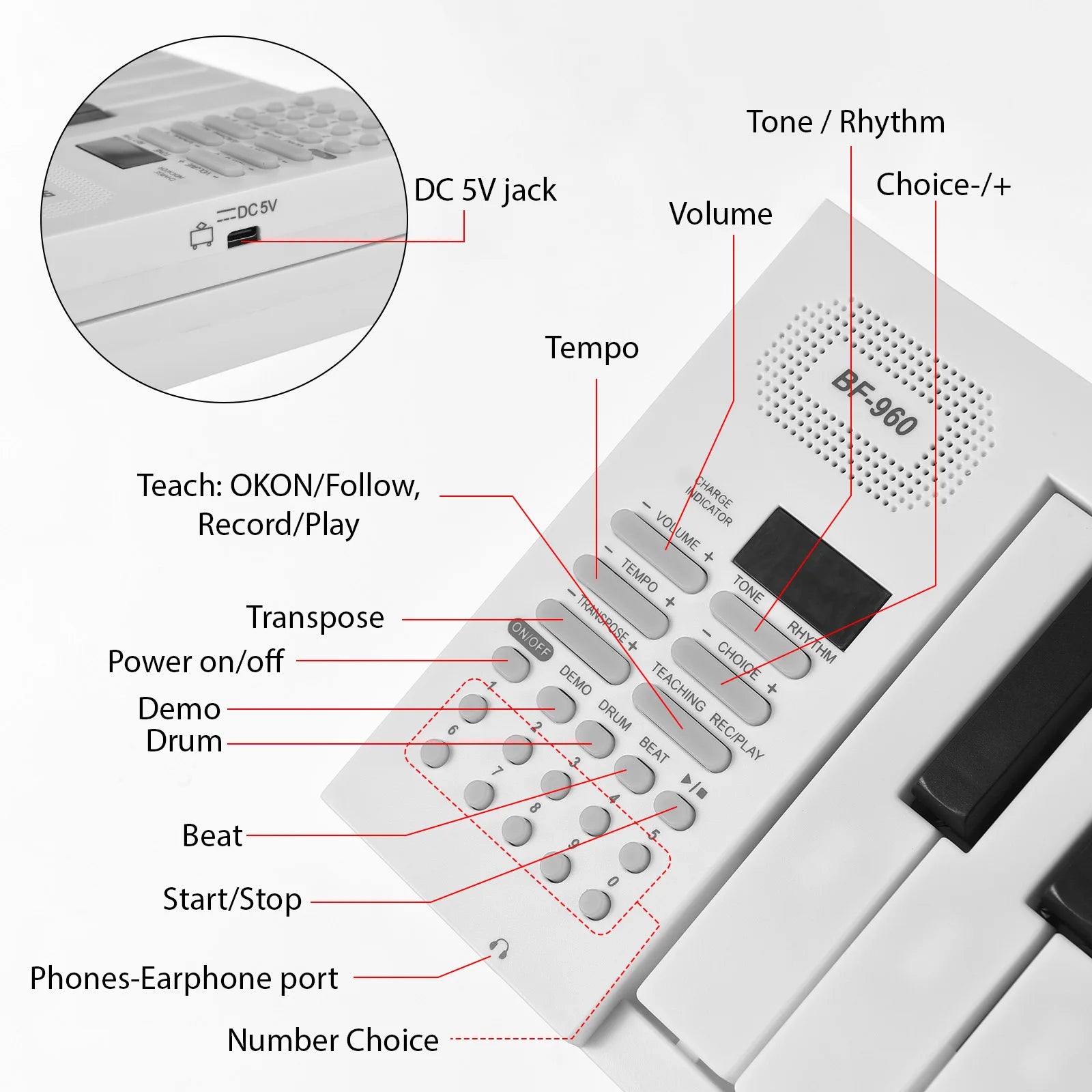 【Versatile Features】: The electronic piano comes with 16 tones, 100 rhythms, and 25 demonstration songs. It also features an LED display, a charging indicator light, volume adjustment, speed adjustment, and transposition. These features provide a wide range of options for users to create their unique music.