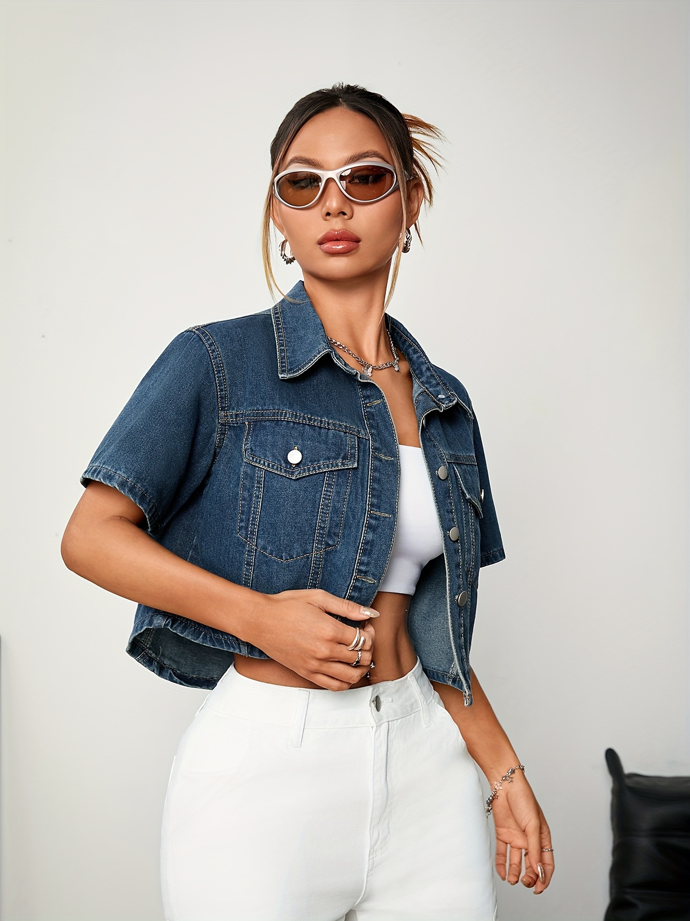 Chic Spring/Summer Women's Denim Jacket - Casual Short Sleeve, Button-Up, Non-Stretch Cotton Blend