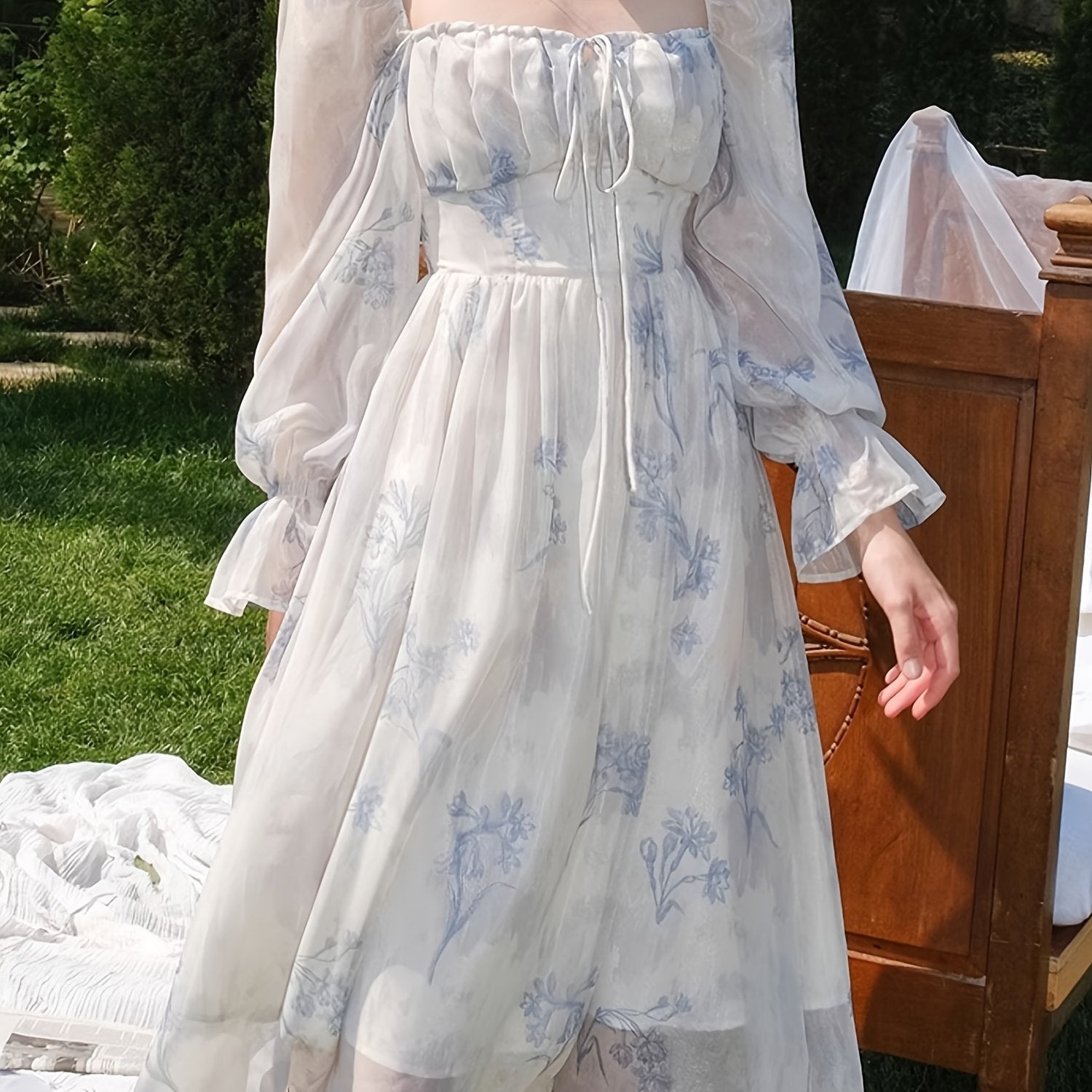 Elegant Floral Chiffon Midi Dress with Bell Sleeves - Square Neck, Long Sleeve, Lightweight, All-Season Wear for Women, Long Sleeve Dress