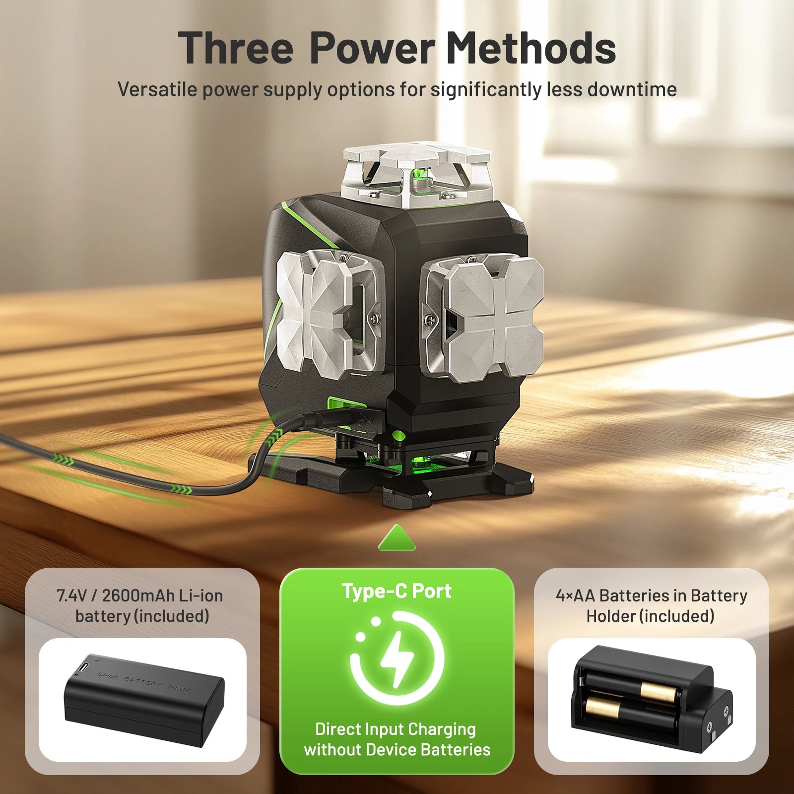- Direct input charging: This laser tool can be used at job site with direct input charging even if take out the battery.