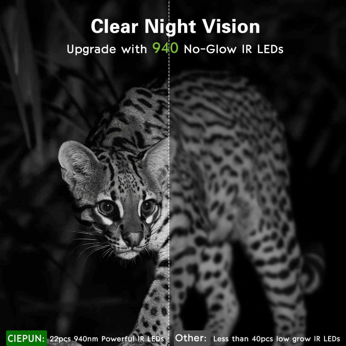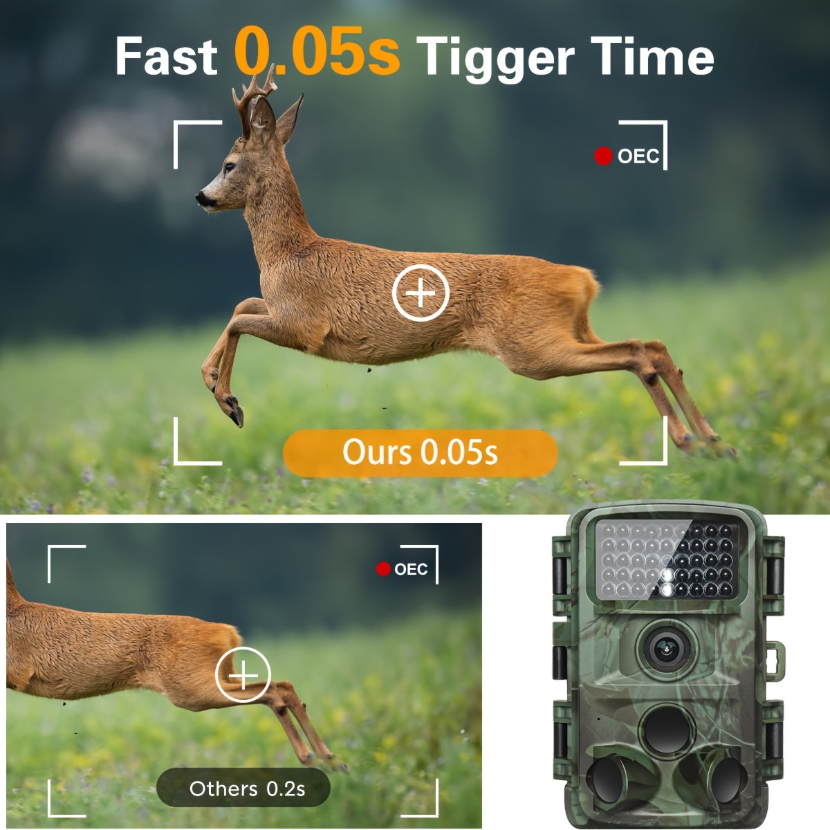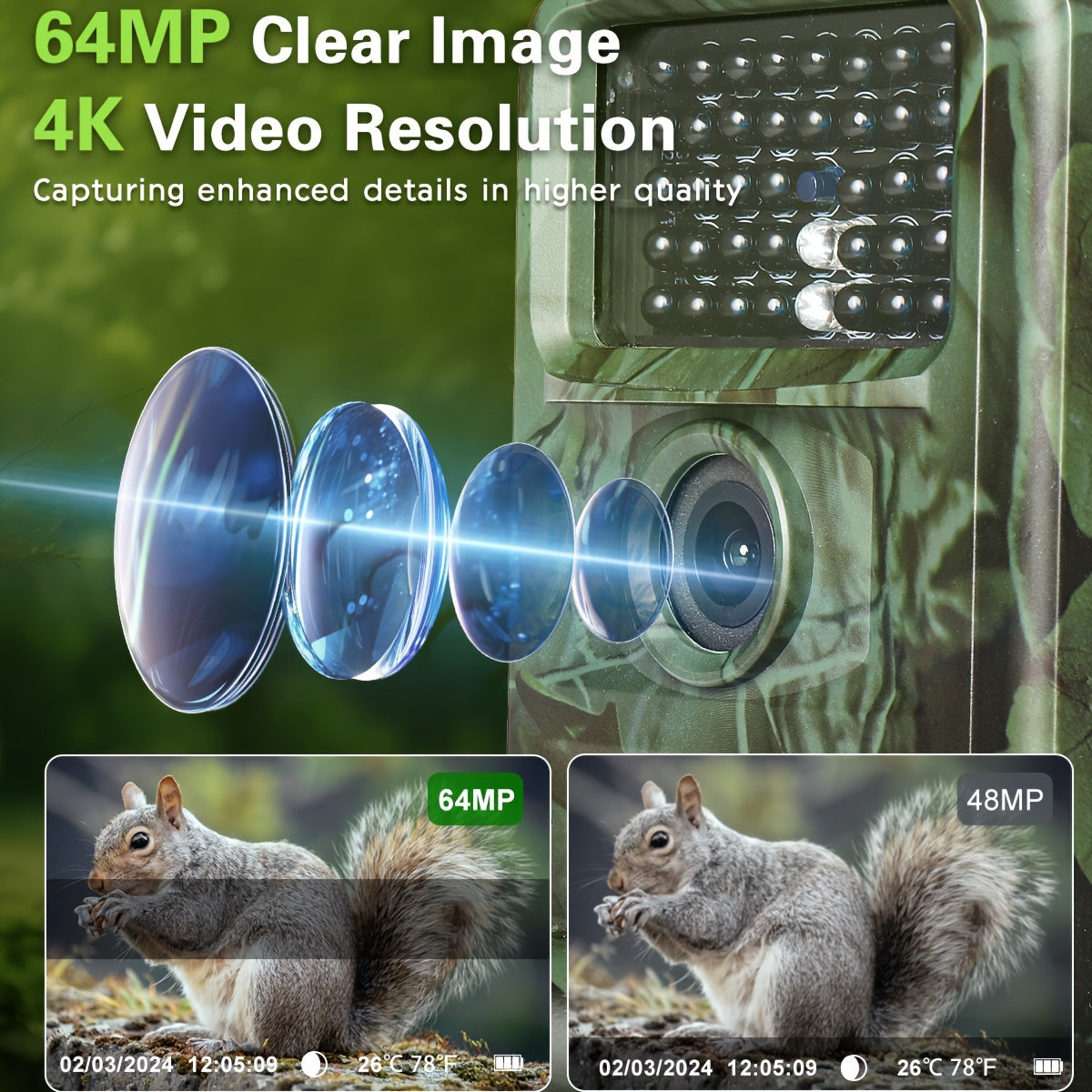Product features: High resolution camera with 64MP capacity, 64GB memory card not provided. Fast trigger speed of 0.5s. Supports video recording at 64MP resolution. Comes with USB Type-C cable. Equipped with 940nm infrared LEDs for night vision. Ideal for photo-trap camera night hunting with 4K camera traps. Requires 8 AA batteries for power, batteries not included.