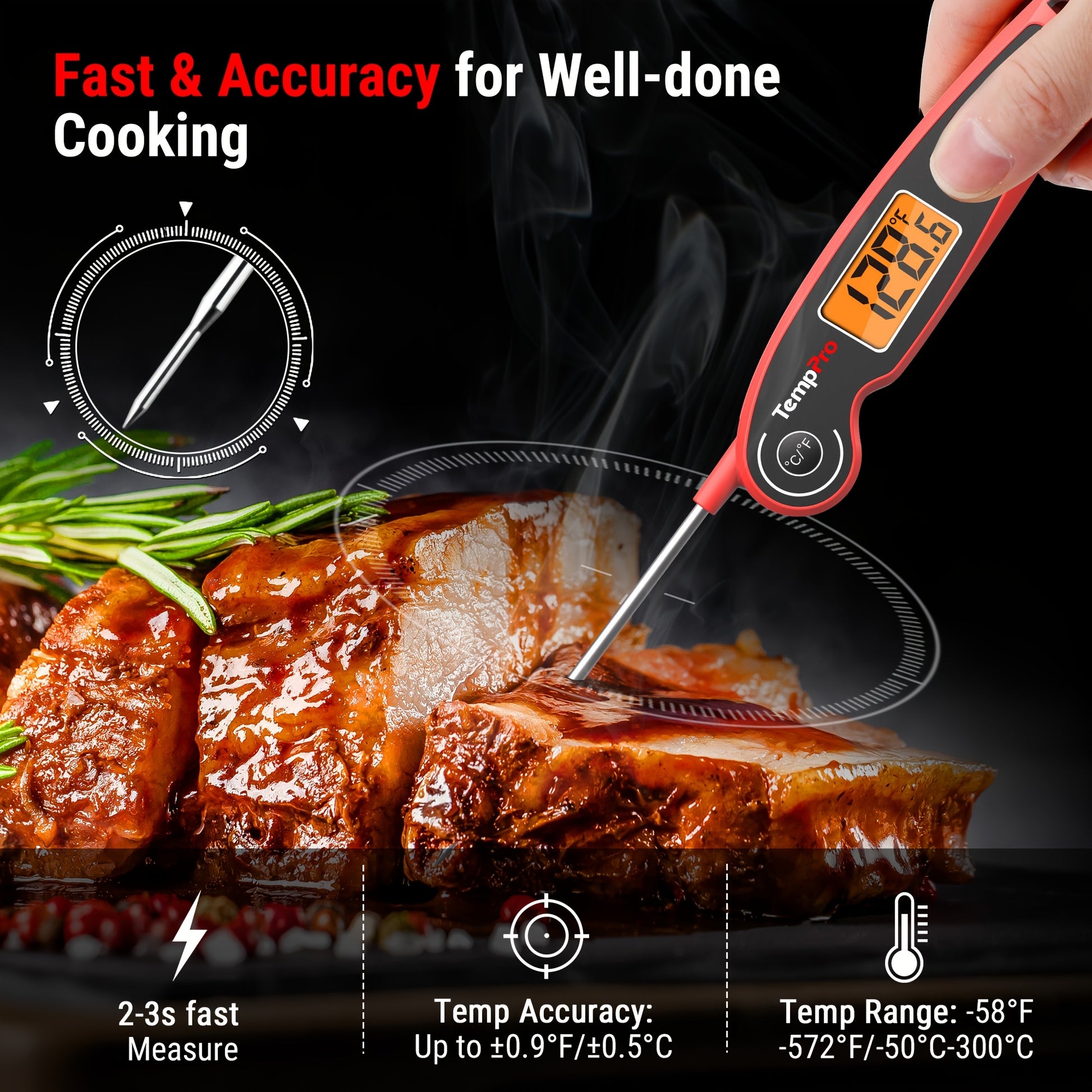 TempPro instant read meat thermometer provides a perfect solution to measure the temperature when cooking, equipped with hold function to lock the temp, no more guessing & waiting!