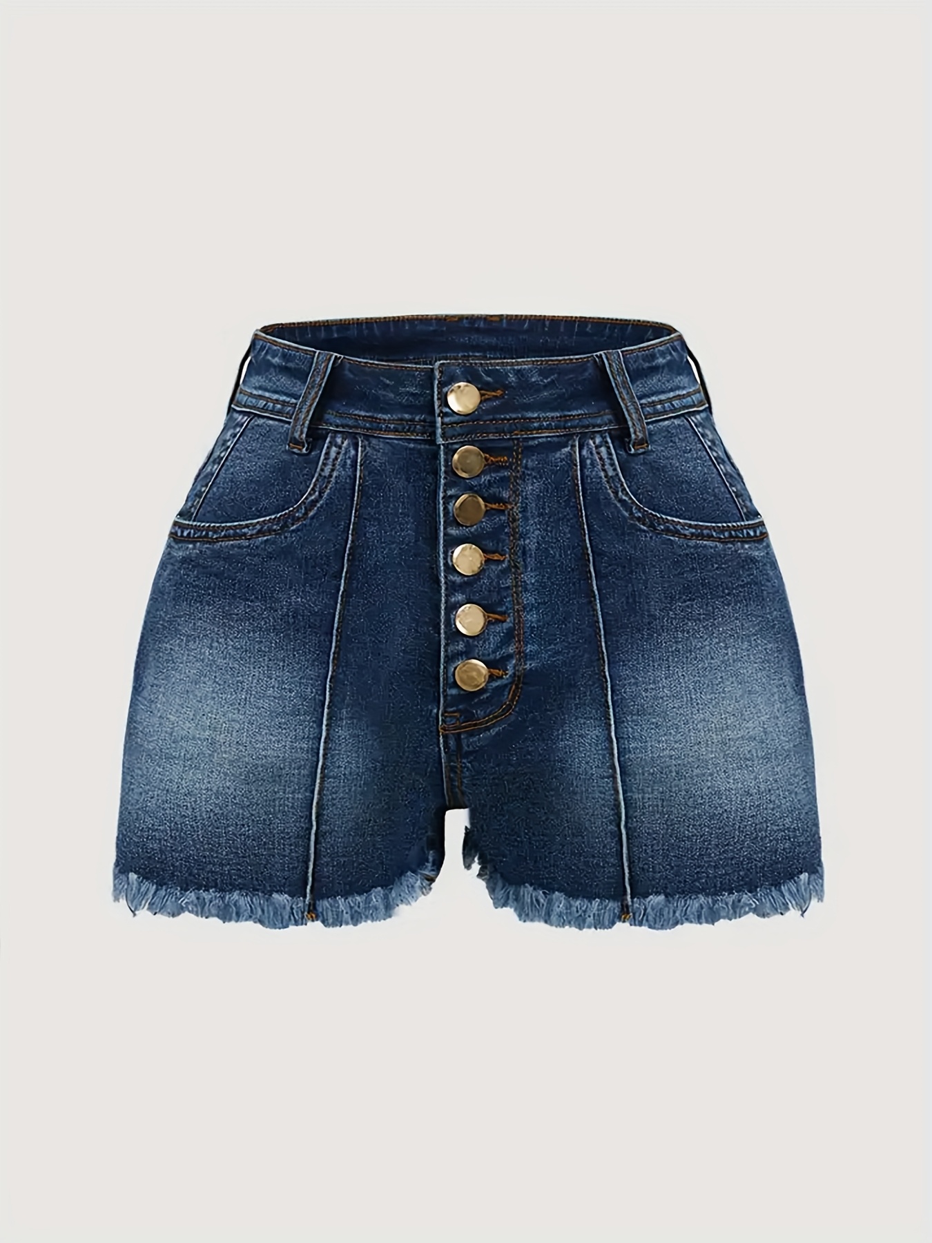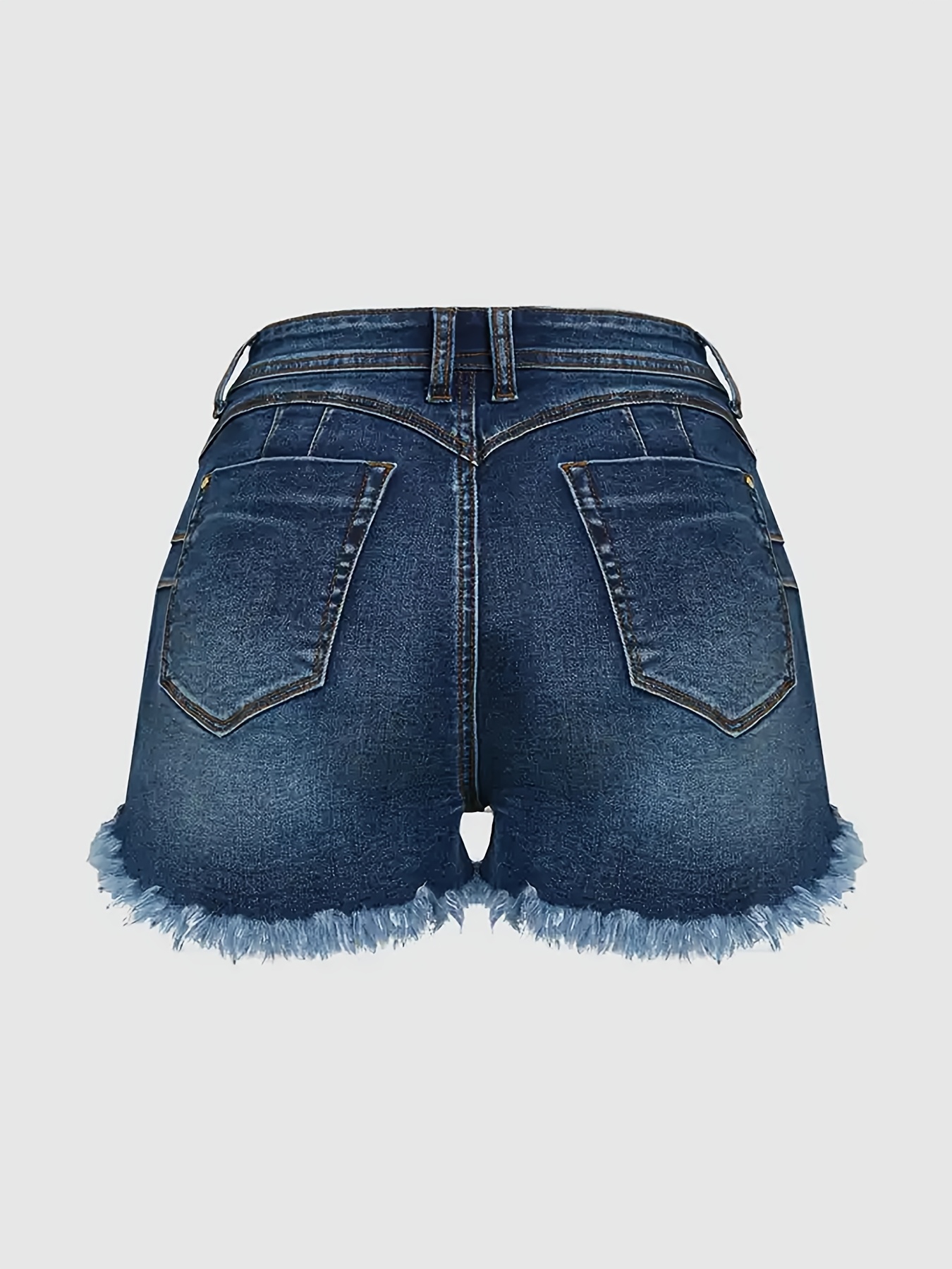 Women'S Front Button Dark Blue Folded Rim Buttocks Fur Edge Pants Feet Denim Shorts